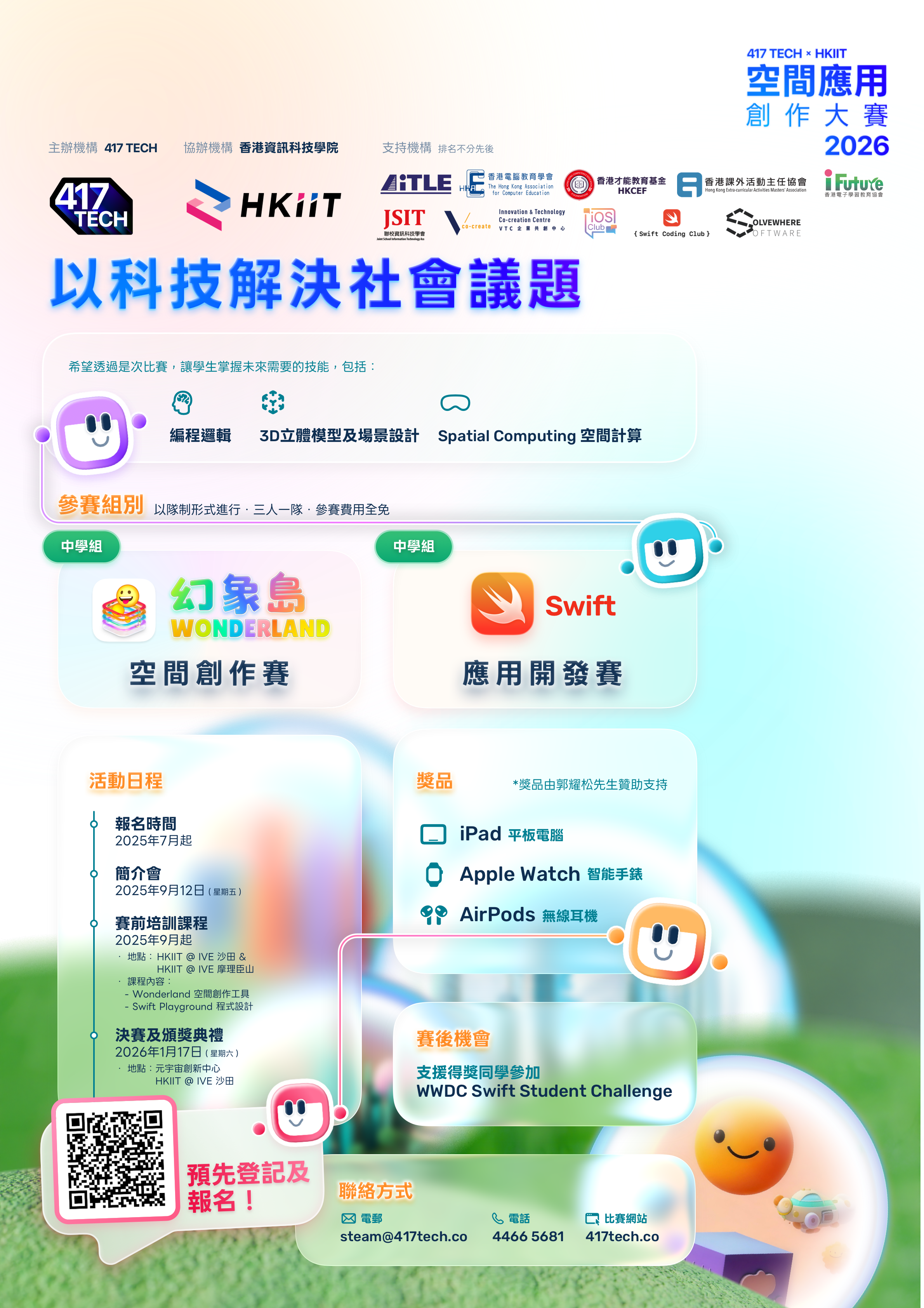🔥 HKIIT 空間應用創作大賽2026 全新登場!由 417 Technology Limited 與 HKIIT 攜手舉辦,為學生提供展示創意的舞台!這次比賽不僅讓學生能發揮創意和技術,還能獲得真實的實戰經驗,為參加 WWDC Swift Student Challenge 做好準備!✨